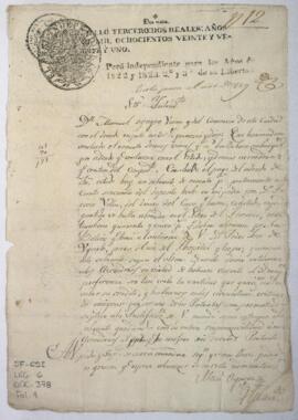 Manuel Oyague, vecino y comerciante de Huánuco, solicita se le adjudique la cantidad de pesos sobrantes del remate de sus bienes por haberse cubierto un crédito a favor del estado, cuyo dinero lo necesita para emigrar, quedando con la responsabilidad de pagar a su acreedor preferente. Ante Jacinto del Risco, intendente de Huánuco.