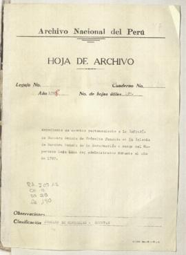 Expediente seguido por Lino de León y Orellana, mayordomo de la cofradía de Nuestra Señora del Tránsito, fundada en la iglesia del Monasterio de Nuestra Señora de la Encarnación; solicitando aprobación de las cuentas de su cargo correspondiente al periodo del 01/01/1787 al 31/12/1787. Incluye comprobantes de cuenta. Ante Ambrosio Zerdán y Pontero, oidor de la Real Audiencia y juez conservador de cofradías.
