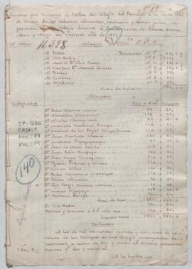 Expediente seguido por José Ignacio Moreno, prebendado de la iglesia Metropolitana, rector del Real Colegio del Príncipe; solicitando la aprobación de cuentas de los gastos del referido colegio, correspondiente a los meses de febrero a mayo (cuadrimestre) del año 1821, y solicita la entrega de cantidad de pesos para la compra de alimentos y otros gastos del colegio de caciques como adelanto al próximo cuadrimestre. Ante Tomás Ignacio Palomeque, juez privativo de la Caja General de Censos de Indios de Lima.