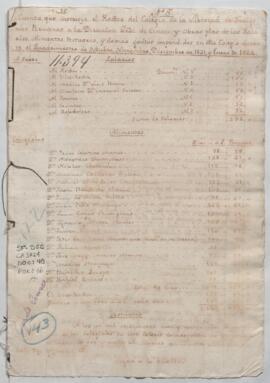 Expediente seguido por José Ignacio Moreno, rector del Colegio de la Libertad de Indígenas Peruanos, solicitando la aprobación de cuentas de los gastos del referido colegio, correspondiente a los meses de octubre a diciembre de 1821 y enero de 1822, y solicitando la entrega de cantidad de pesos para la compra de alimentos y otros gastos del colegio como adelanto al próximo cuadrimestre. Ante Manuel Villarán, director general de Censos y Obras Pías.