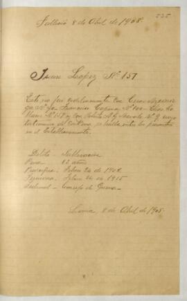 Apunte sobre el reo Francisco López, codelincuente con César Arciniega, Francisco Capinay y otros; sentenciado a 13 años de penitenciaría por sublevación. Falleció el 08/04/1908.
