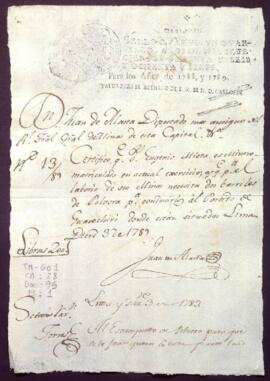 Certificación expedida por Juan de Alaita, diputado del Real Tribunal General de Minería de Lima sobre la cantidad de arrobas de pólvora que necesita Eugenio Miota para el laboreo de sus minas situadas en el partido de Huarochirí.