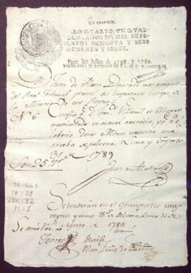 Certificación expedida por Juan de Alaita, diputado del Real Tribunal General de Minería de Lima sobre la cantidad de arrobas de pólvora que necesita Francisco Villamil para el laboreo de sus minas.