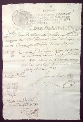 Certificación expedida por Juan de Alaita, diputado del Real Tribunal General de Minería de Lima sobre la cantidad de arrobas de pólvora que necesita Pascual Luege para el laboreo de sus minas situadas en Chancay.