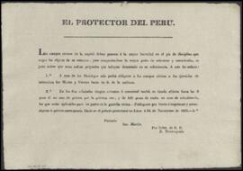 Bando impreso de José de San Martín, general, protector del Perú, ordenando que los cuerpos cívicos deben ejercer instrucción, además de los domingos, los días martes y viernes hasta las nueve de la mañana, durante los cuales ningún artesano o menestral tendrá su tienda abierta bajo pena de un mes de prisión y pago de 100 pesos de multa.