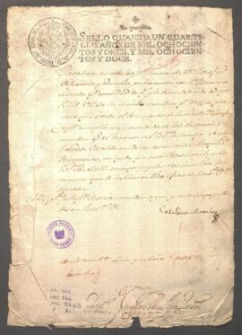 Catalina Morales, albacea de Josefa Sifuentes y Dávalos, en los autos contra Francisco Lozada sobre cantidad de pesos por deuda; solicita entrega de testimonio de testamento de dicha Josefa. Ante José Bernardo Tagle Isásaga y Portocarrero, marqués de Torre Tagle, alcalde ordinario de Lima.
