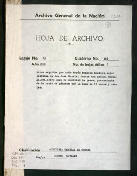 María Manuela Montoya, mujer legítima de Juan Sorela, contra Manuel Rospigliosi, sobre cantidad de pesos por la venta de diversas especies de géneros. Ante Diego Miguel Bravo de Rivero y Zavala, marqués de Castel Bravo, auditor general de Guerra.
