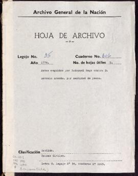 José Collado, en nombre de Manuel Gago, contra Antonio Aranda sobre cantidad de pesos por la venta de aguardiente. Adjunta escritura de obligación de pago. Ante José Velarde y Tagle, abogado de la Real Audiencia, alcalde ordinario de Lima.