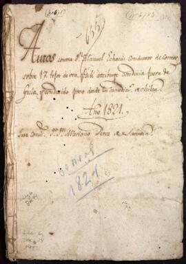 Autos de oficio seguidos por Mariano Pérez de Saravia, juez comisionado, contra Manuel Echaniz, conductor de correos, por cantidad de tejos de oro. Incluye declaración de testigos. Ante José de San Martín, capitán general del Ejército Libertador del Perú.