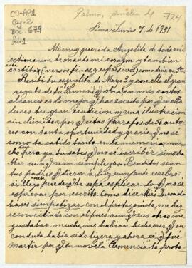 Carta de Amelia [Palma] a Angélica Palma, informa que ha recibido su esquela con la obra Fernan Caballeroy expresa el gusto por la obra, solicita que le explique la situación del rey Alfonso XIII y la monarquía.