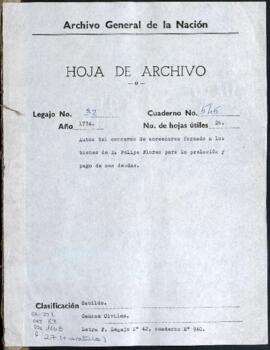 Antonio Bruno, en el concurso de acreedores de Felipe Flores, sobre entrega de un cajón de rivera a Jacinto Espinoza. Incluye testimonio de escritura, mandamientos. Ante Francisco de Rosas y Zegarra, maestre de campo, alcalde ordinario de Lima.