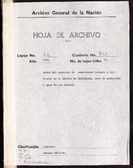 Concurso de acreedores a los bienes de Matías Rodríguez y María Josefa de Águila, su esposa. Incluye mandamiento, testimonio de escritura, razón. Ante José González Gutiérrez, caballero de la Orden de Santiago, alcalde ordinario de Lima.