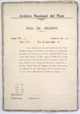Expediente seguido por Pedro Eusebio Gómez de la Barreda y Mendoza, hijo de Francisco Gómez Bueno e Ignacia Rendón de la Barreda; solicitando confirmación del Auto de Cabildo de Lima sobre su reconocimiento como noble e hijodalgo. Contiene información de testigos sobre su acreditación como hermano de Juan Manuel Gómez de la Barreda. Ante el Superior Gobierno.