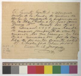 Compromiso de Vicente A. Márquez, director la banda de música de Moche, mediante el cual se compromete con la Sociedad Larco Herrera Hermanos, a asistirles con una banda de músicos en los días de carnaval, los días 5, 6, y 7 [de marzo].