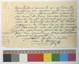 Compromiso de Vicente A. Márquez, [director de la banda de música de Moche], mediante el cual se compromete con la Sociedad Larco Herrera Hermanos, a asistirles con una banda de músicos en los días de fiestas patrias durante el 28; 29 y 30 de julio.