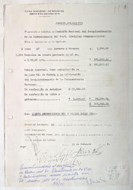 Copia de presupuesto presentado por la Casa Nacional de Moneda a la Comisión Nacional del Sesquicentenario de la Independencia del Perú, sobre la cotización para fabricación de medallas conmemorativas.