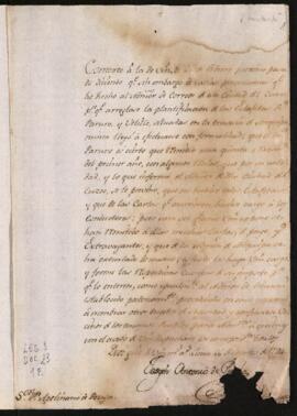 Correspondencia de José Antonio de Pando y Riva, administrador general de la renta de Correos del Perú, a Apolinario de Poziga, administrador comisionado de Correos del Cusco, sobre la planificación de las estafetas de Paruro, Velille y Sicuani.
