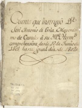 Cuentas de cargo y data presentada por José Antonio de Errea, mayordomo y administrador de las rentas de la Hermandad de Cárceles de Lima; correspondiente al periodo del 12/06/1801 al 12/06/1802. Aprobada por el conde de Torre Velarde y José Valentín Huid