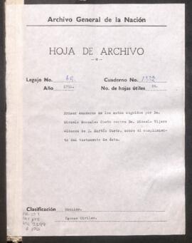 Baltazar de los Reyes, en nombre de María González Cueto, su hermana, sobre cumplimiento de testamento de Rosa López Mazao y Matías Cueto, su madre y su hermano respectivamente, para división y partición de bienes. Incluye testimonio de escritura, declaraciones, cuentas. Ante José Matías Vásquez de Acuña y Menacho, conde de la Vega del Ren, alcalde ordinario de Lima.
