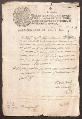 El abogado defensor general de menores de Lima, en los autos del cumplimiento del testamento de Salvador de Casas, solicita entrega de una licencia para la venta de sus bienes. Ante José Mariano Sánchez Boquete Román de Aulestia, marqués de Montealegre, alcalde ordinario de Lima.