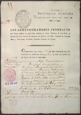 Borrador de certificación expedida por los administradores del Tesoro Público, dejando constancia que han recibido de Tomás Requena, subastador de diezmos del partido de Carabayllo, la recaudación de novenos del plazo de navidad de 1826.
