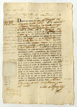 Escritura de venta otorgada por Luis de Aquejolo, comerciante, a Cipriano Zanabria por un negro bozal sin bautizar nombrado Francisco, de catorce años. Contiene carta de pago.
