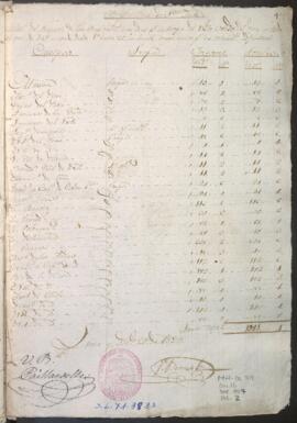 Relación de los importes de las estancias de efectivos del Cuerpo del Ejército del Perú en el hospital militar Santa Ana, formado por José Bernales, correspondiente al mes de diciembre de 1823. Incluye relación de integrantes de dichas estancias.