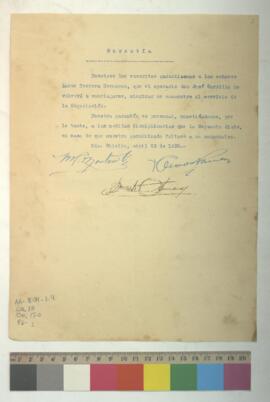 Garantía suscrita por [¿M. Monten?], [¿Ernesto Otiniano?] comprometiendose a los señores Larco Herrera Hermanos a que José Carrillo, operario no volverá a embriagarse mientras se encuentre al servicio de la Negociación.