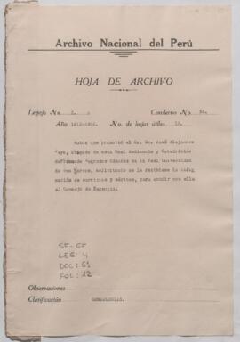 Expediente seguido por José Alejandro Jayo, abogado de la Real Audiencia y catedrático de vísperas de canones de la Real Universidad, hijo de Gerónimo Jayo y María Ignacia Riquelme de la Barrera; solicitando se le reciba información de oficio sobre la calidad, idoneidad y conducta de su persona para postular al cargo de oidor. Incluye solicitud sobre sus servicios prestados como abogado de pobres en lo criminal. Ante el Real Acuerdo de la Audiencia de Lima.