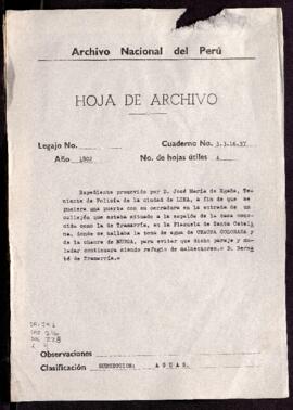 José María Egaña, teniente de policía, sobre colocación de puerta en un muladar, donde se encuentra la toma que da agua a chacra colorada y de Murga, camino a la portada de Santa Catalina, por ser lugar peligroso y refugio de malhechores. Ante Manuel Pardo Rivadeneira, oidor de la Real Audiencia y juez de aguas de Lima. Procede del Superior Gobierno.