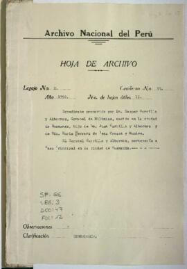 Expediente seguido por Gaspar Carrillo y Albornoz, coronel de Milicias, natural de Huamanga, hijo de Juan Carrillo y Albornoz , y de María Herrera de Vega Cruzat y Munive, marqueses de Feria, solicitando se remita al Rey, el informe de sus méritos y servicios elaborado por el Cabildo de Lima. Ante la Real Audiencia de Lima.