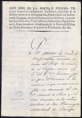 Nombramiento del capitán Francisco Moar, adicto al Estado Mayor de Guerra, como secretario de la comisión de pacificación, otorgado por José de la Serna e Hinojosa, teniente general de los Ejércitos Nacionales, virrey del Perú. Contiene escudo de armas impreso.