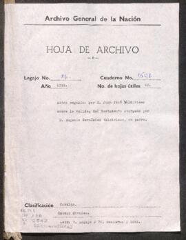 Diego Gorostizaga, en nombre de Juan José Valdivieso Villarroel, albacea de su madre Úrsula Villarroel y Cabero, contra Eugenio Valdivieso, su hermano, sobre calidez de testamento y nulidad de codicilio de su padre Eugenio Fernández de Valdivieso y Arbizu, por cláusula que lo favorecen. Ante Fernando Carrillo y Mudarra, marqués de Santa María, alcalde ordinario de Lima.