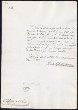 Oficio de José de la Serna, virrey del Perú, a los diputados de la Junta de Pacificación, ordenando informen sobre el estado de la negociación de armisticio con los diputados del general San Martín por estar a punto de fenecer el tiempo de la suspensión de hostilidades.