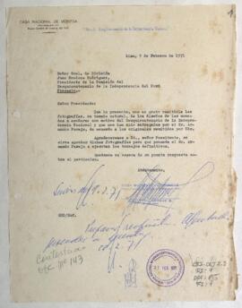 Oficio de la Casa Nacional de Moneda a Juan Mendoza Rodríguez, general de División y presidente de la Comisión Nacional del Sesquicentenario de la Independencia del Perú, comunicando la remisión de las fotografías de los diseños de las monedas a acuñarse con motivo del Sesquicentenario de la Independencia Nacional.