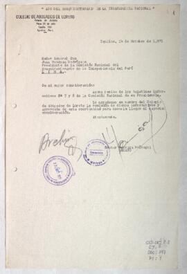 Oficio de Héctor Barriga Reátegui, Decano del Colegio de Abogados de Loreto a Juan Mendoza Rodríguez, general de División y presidente de la Comisión Nacional del Sesquicentenario de la Independencia del Perú, comunicando que ha recibido los Boletines Informativos N° 7 y 8 de la Comisión Nacional.