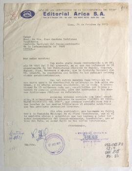 Oficio de Benjamín Romero, director de Ediciones de Editorial "Arica S.A." a Juan Mendoza Rodríguez, general de División y presidente de la Comisión Nacional del Sesquicentenario de la Independencia del Perú, comunicando el envío de seis colecciones de libros y textos de su producción para las bibliotecas públicas de Huacho, Chancay, Huaura, Supe, Barranca y Végueta, así mismo remite seis colecciones de retratos de su "Galería de personales históricos del Perú". Incluye guías.