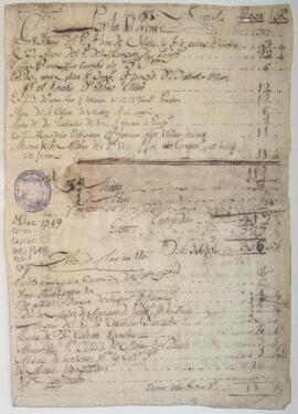 Fragmento de un libro de cuentas de las entradas por misas predicadas, cantadas, rezadas, abonos, donaciones, donde a los totales en pesos y reales se les resta gastos no determinados, y donde el saldo a favor de un mes no es consignado para el siguiente.