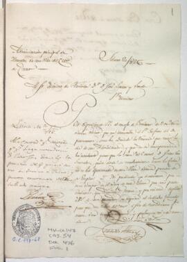 Oficio de Custodio Alvarez, administrador de las alcabalas de Cerro de Pasco, a José Larrea y Loredo, ministro de Hacienda, solicitando que se envíe a Pedro José Gonzales para que se presente y lo releve del cargo lo más pronto posible debido al clima y su edad.