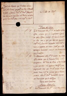 Reparos presentados por Pedro Dionisio Gálvez, contador del Tribunal Mayor de Cuentas de Lima, a las cuentas de Francisco de Miangolarra, comisario interino de Guerra y Marina, correspondiente al periodo de octubre de 1806 a setiembre de 1807. Incluye rec