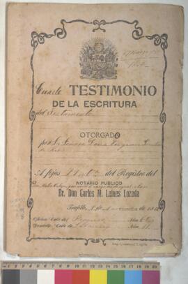 Testimonio de escritura de testamento, expedido por Carlos M. Laines Lozada, notario público de la provincia de Trujillo, sobre el registro del testamento de Virginia Pinillos de Ríos, quien deja sus bienes a Esevan Ríos, su esposo y a sus cuatro hijos.