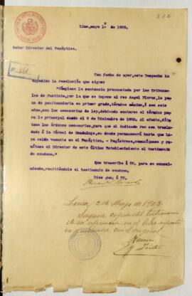 Testimonio de condena de Ángel Flores, sentenciado a 6 años de penitenciaría por el homicidio de Ambrosio Lezano, arriero. Pronunciada por la Corte Suprema de Justicia. Expedido por Manuel E. Rodríguez, escribano de Estado. Incluye oficio.