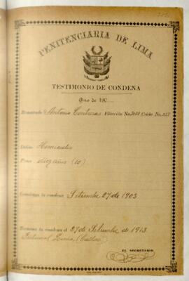 Testimonio de condena de Antonio Contreras, sentenciado a 10 años de penitenciaría por el delito de homicidio. Pronunciada por la [Corte Superior de Justicia de Lima]. Expedido por Nicanor G. Corzo, escribano de Estado. Contiene filiación e incluye oficio.