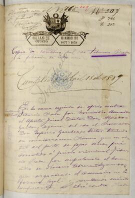 Testimonio de condena de Tiburcio Prada, sentenciado a 12 años de penitenciaría por el homicidio de Nasario Cabrera. Pronunciada por Manuel Vicente Morote, juez de primera instancia de Lima. Expedido por Manuel Aurelio Bonilla, escribano. Contiene filiación. [Cumplió condena el 18/04/1889].