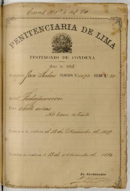 Testimonio de condena de José Salas, sentenciado a 7 años de penitenciaría por introducir y expender moneda falsa. Pronunciada por José Viterbo Arias, juez de primera instancia de Lima. Expedido por Abelardo L. Montes, escribano del crimen.