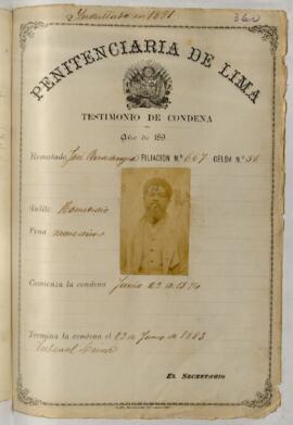 Testimonio de condena de José Rivadeneyra, sentenciado a 9 años de penitenciaría por el homicidio frustrado de Melchora Smith. Pronunciada por Manuel Carmelino, juez de primera instancia de Lima. Expedido por Félix A. Brendis, escribano. Contiene filiación. [Fue indultado por la Municipalidad en 1881].