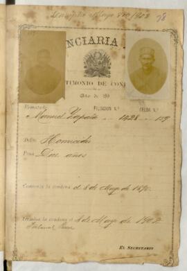Testimonio de condena de Manuel Zapata, sentenciado a 12 años de penitenciaría por el homicidio de Nicanor Morales. Pronunciada por la [Corte Superior de Justicia de Piura]. Expedido por Luis León y León, secretario. [Cumplió condena el 08/05/1902].