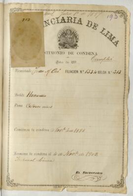 Testimonio de condena de Nicanor Gonzales (Agustín Lagunas), sentenciado a 12 años de penitenciaría por el homicidio de Manuel Vivaz, y a 9 meses de cárcel por quebrantamiento de una anterior sentencia. Pronunciada por José Viterbo Arias, juez de primera instancia de Lima. Expedido por Manuel Federico Ávalos, escribano del crimen. Contiene filiación. [Cumplió condena el 01/10/1902].