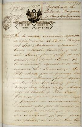 Testimonio de las condenas de Salvador Burgueros y José Malamoco, sentenciados a 4 años de penitenciaría y 5 meses de arresto, respectivamente, por el robo de relojes, alhajas y dinero de la tienda de Carlos Alcorta, situada en la calle de Bodegones. Pronunciada por Manuel Carmelino, juez de primera instancia de Lima. Expedido por Félix A. Brendis, escribano. Contiene filiaciones.